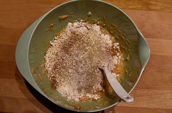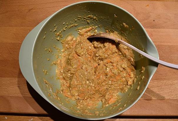hele i en skål, og tilsæt linser, æg, havregryn, hvedemel