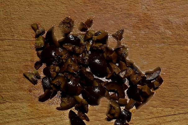 Hak olivenene, blend tun, ansjoser og kapers. Dryp