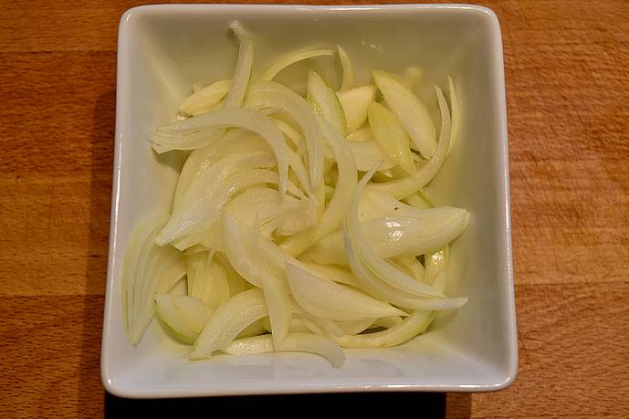 Skær løgene i strimler og steg dem gyldne.
