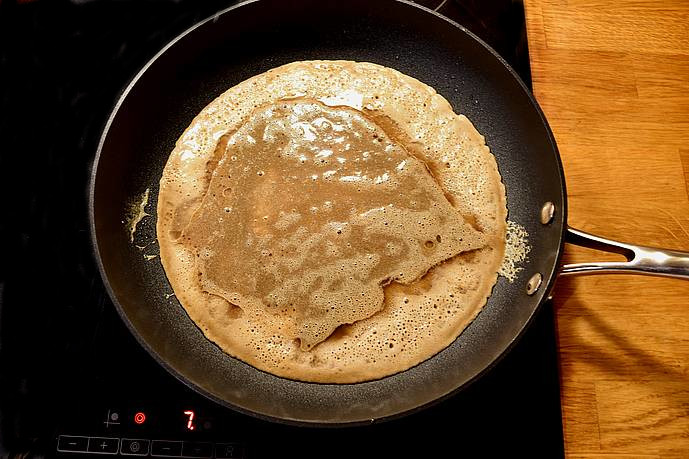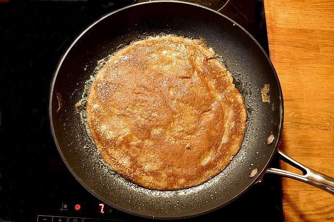 varme med lidt olie. Tilsæt æggemassen, steg omeletten til den er gylden på begge sider,