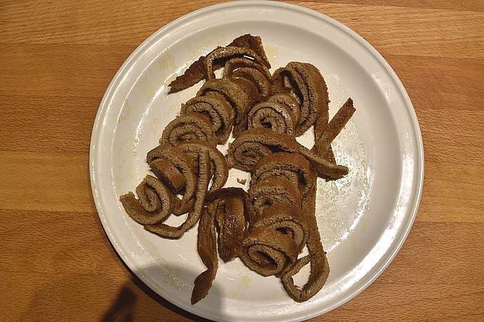 i tynde strimler, modsat fiberene