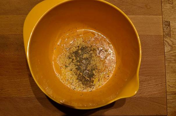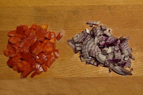 Hæld ægge-osteblandingen ud over grøntsagerne,