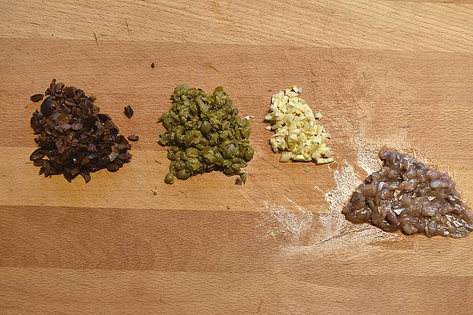 Start med at hakke oliven, kapers, ansjoser og hvidløg meget fint og hver for sig