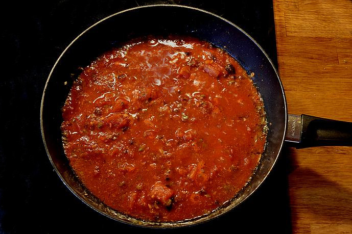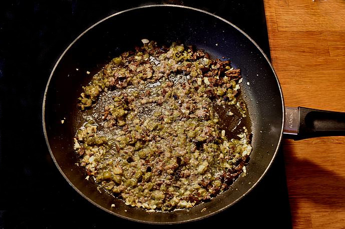 tilsæt oliven, kapers, og ansjoser, og det hele får lov til at stege lidt under omrøring.
