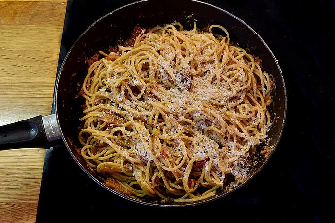Det hele blandes med den kogte pasta, gem i øvrigt altid lidt af pastavandet til