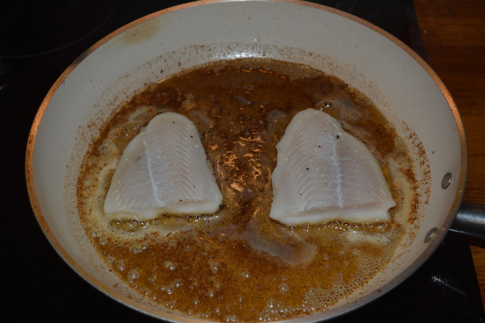 Vend fisken, træk pande fra varmen, og steges i