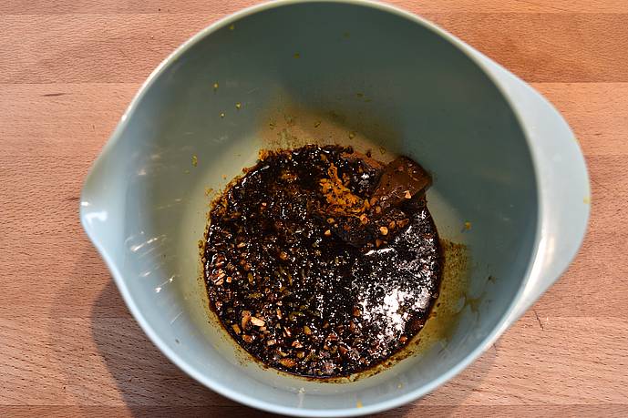 Start med marinaden, bland først de 12 ingredienser i en plastskål