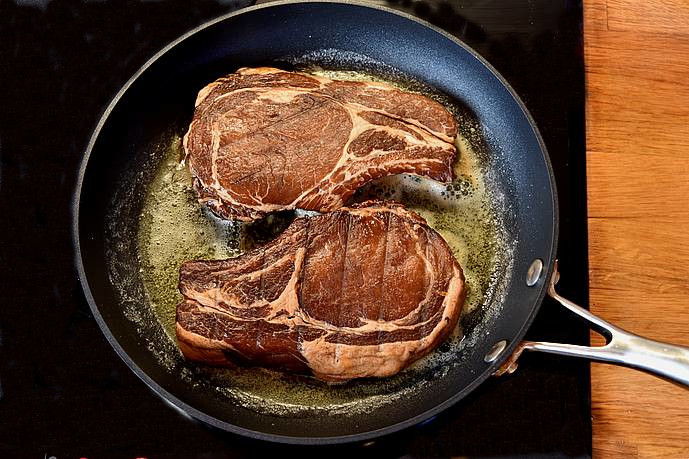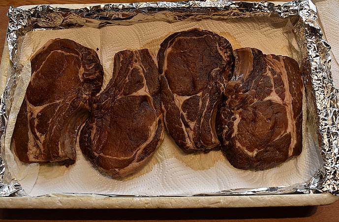 Skyl og dup koteletterne tør med køkkenrulle, ryg nu dem ca. 2 timer