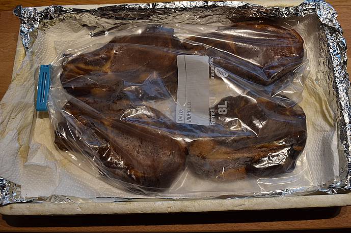 Kom de røgede koteletter i en plastpose i et par døgn, så røgen fordeler sig