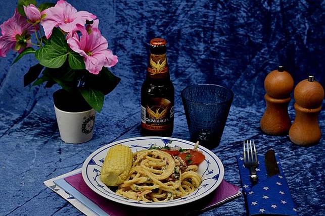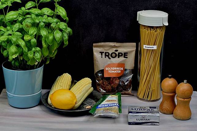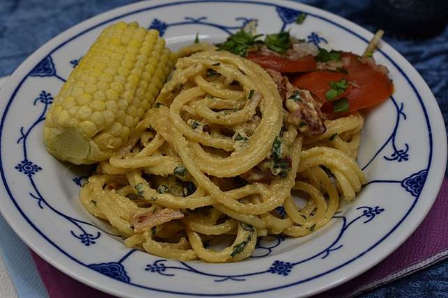 Dagens tallerken, Carbonara med majs, bacon og tomatsalat
