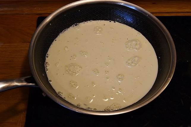 af. Kom fløde, salt og peber på en pande og bring det i kog.