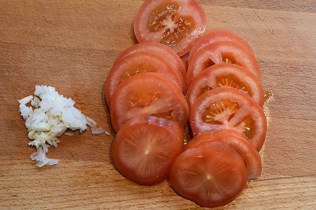 skær tomaterne i skiver og hak løget fint