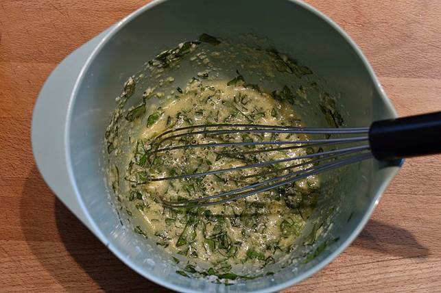 bland æggene, frisk basilikum og ¾ dl. af osten sammen i en skål.