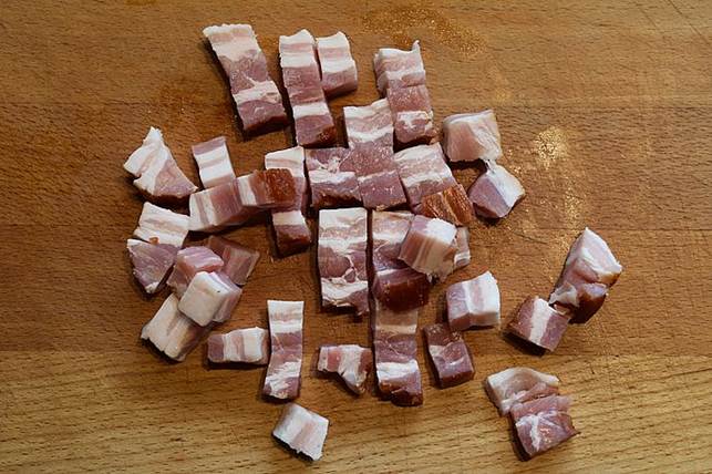 Skær bacon og løg du i små stykker og steg dem på