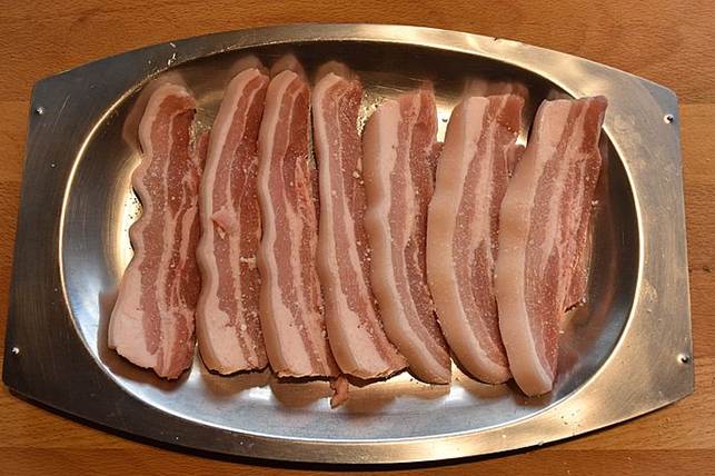 4-500g grisebryst i skiver ca. 1cm. tykke