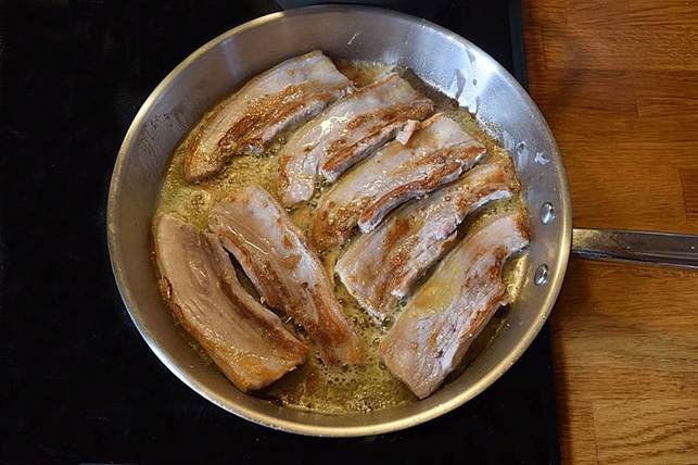 varm panden op ved god varme, løg skiverne af flæsk på panden