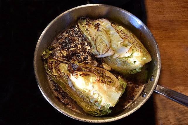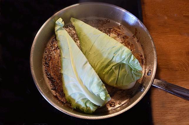 spidskålen på langs i halve eller kvarte, krydr snitflade med salt