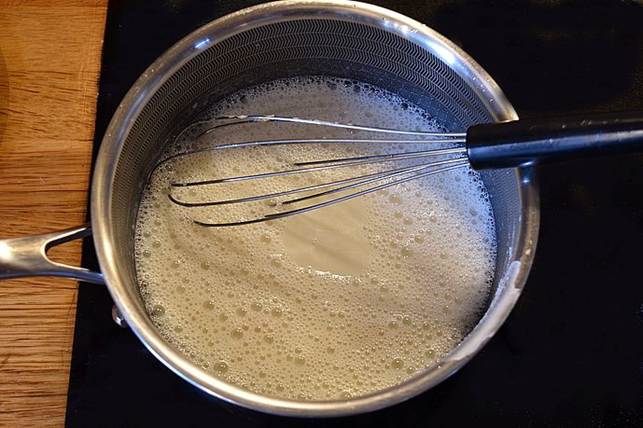 sammen i en melrysterer og hæld det i en tykbundet gryde. Pisk resten af mælken