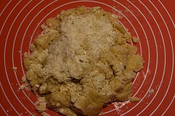 ud på et meldrysset underlag og æltes i hånden i et par