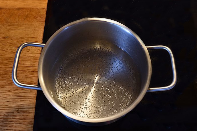 Tag en gryde og kom ½ l vand i, sæt den over varmen og kog op