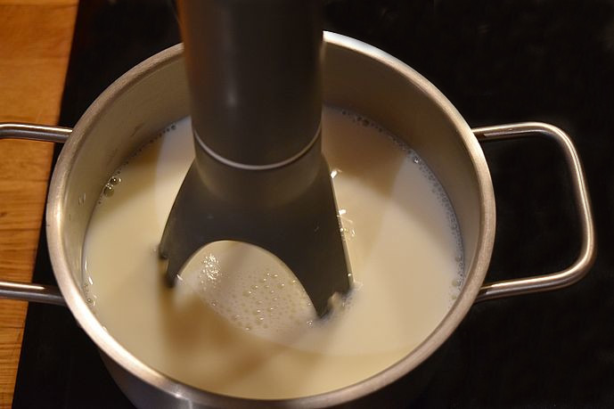 Mælken koges op til kogepunktet, giv mælken et nip salt, der røres i mælken